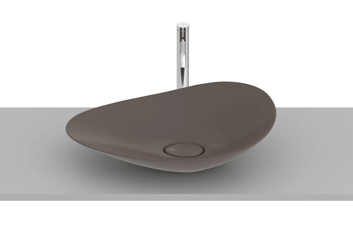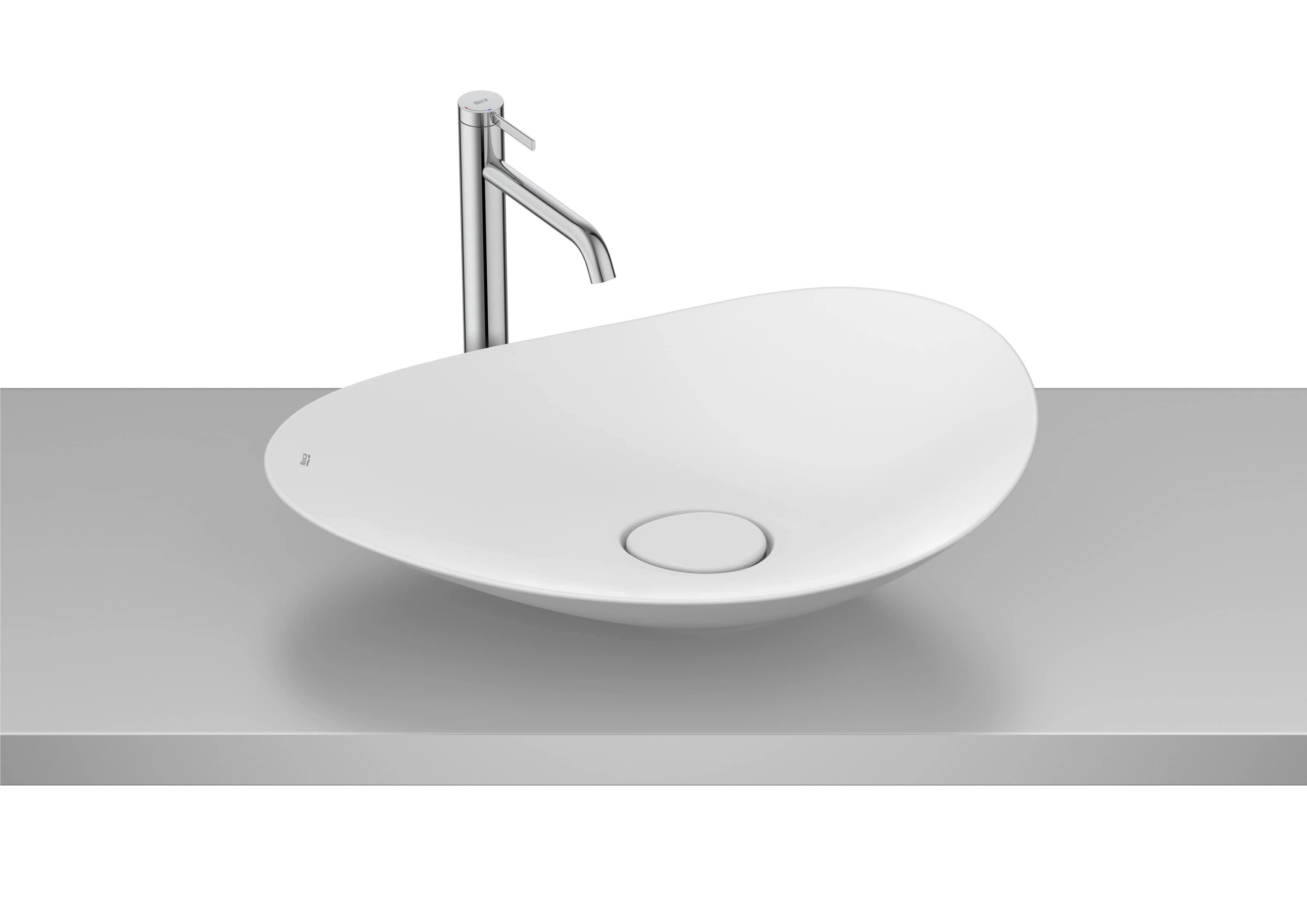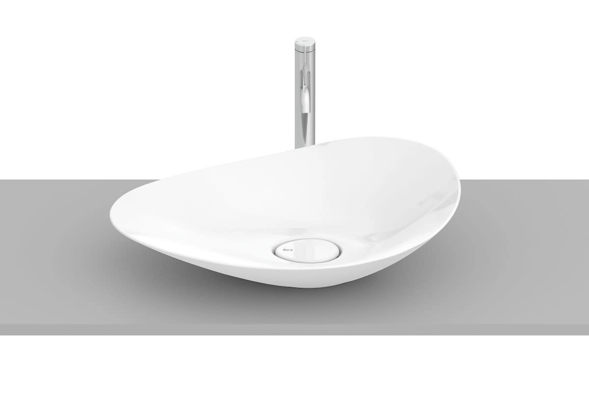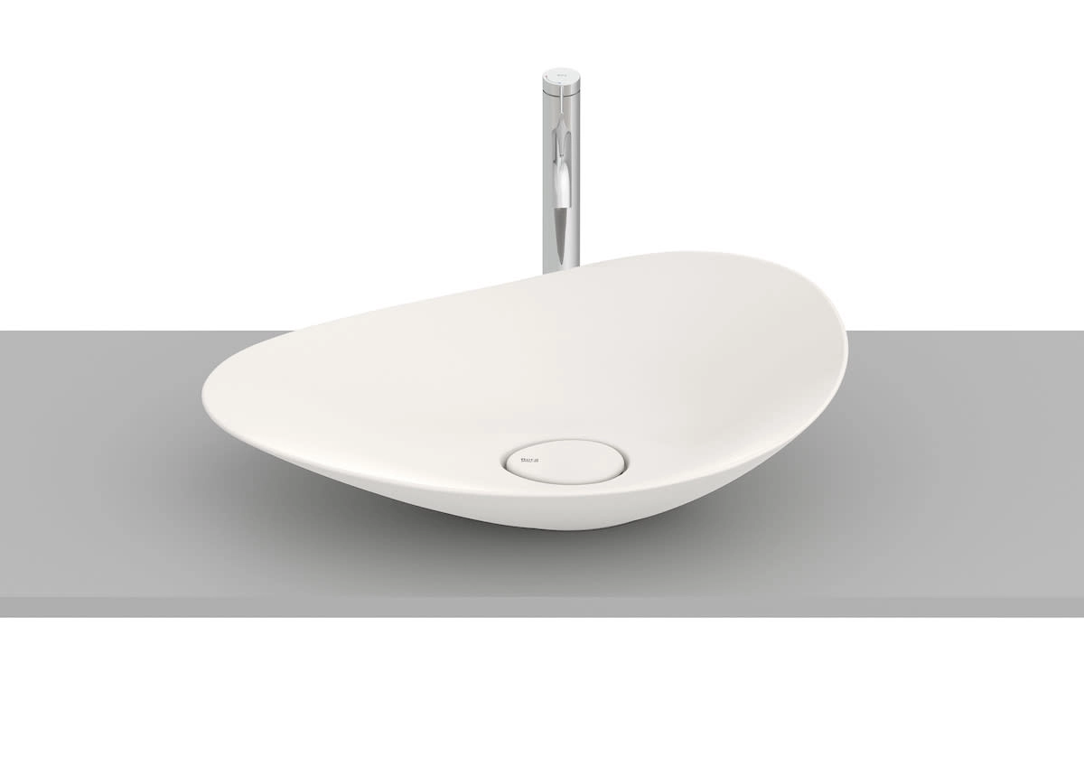 A cuba de apoio oval FineCeramic® Ohtake da Roca combina forma orgânica e beleza atemporal. Inspirada na simplicidade e fluidez da natureza, particularmente no formato do “copo-de-leite”.