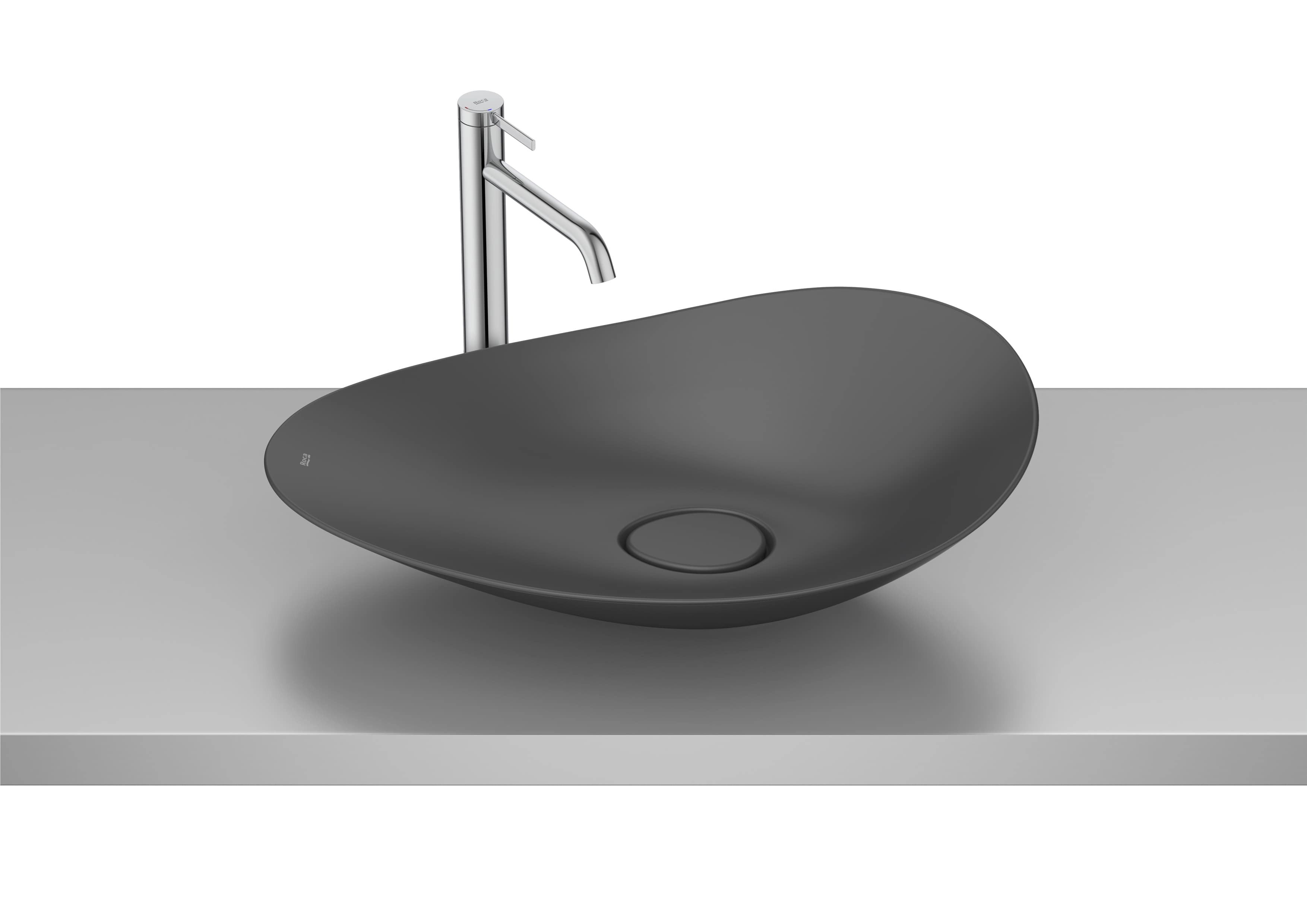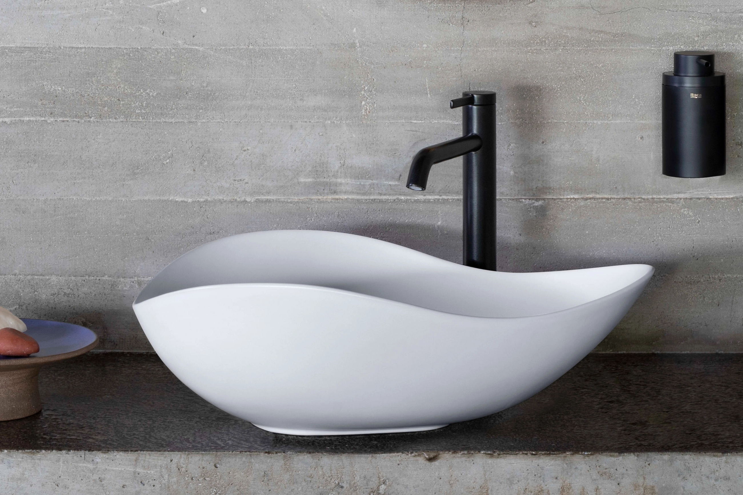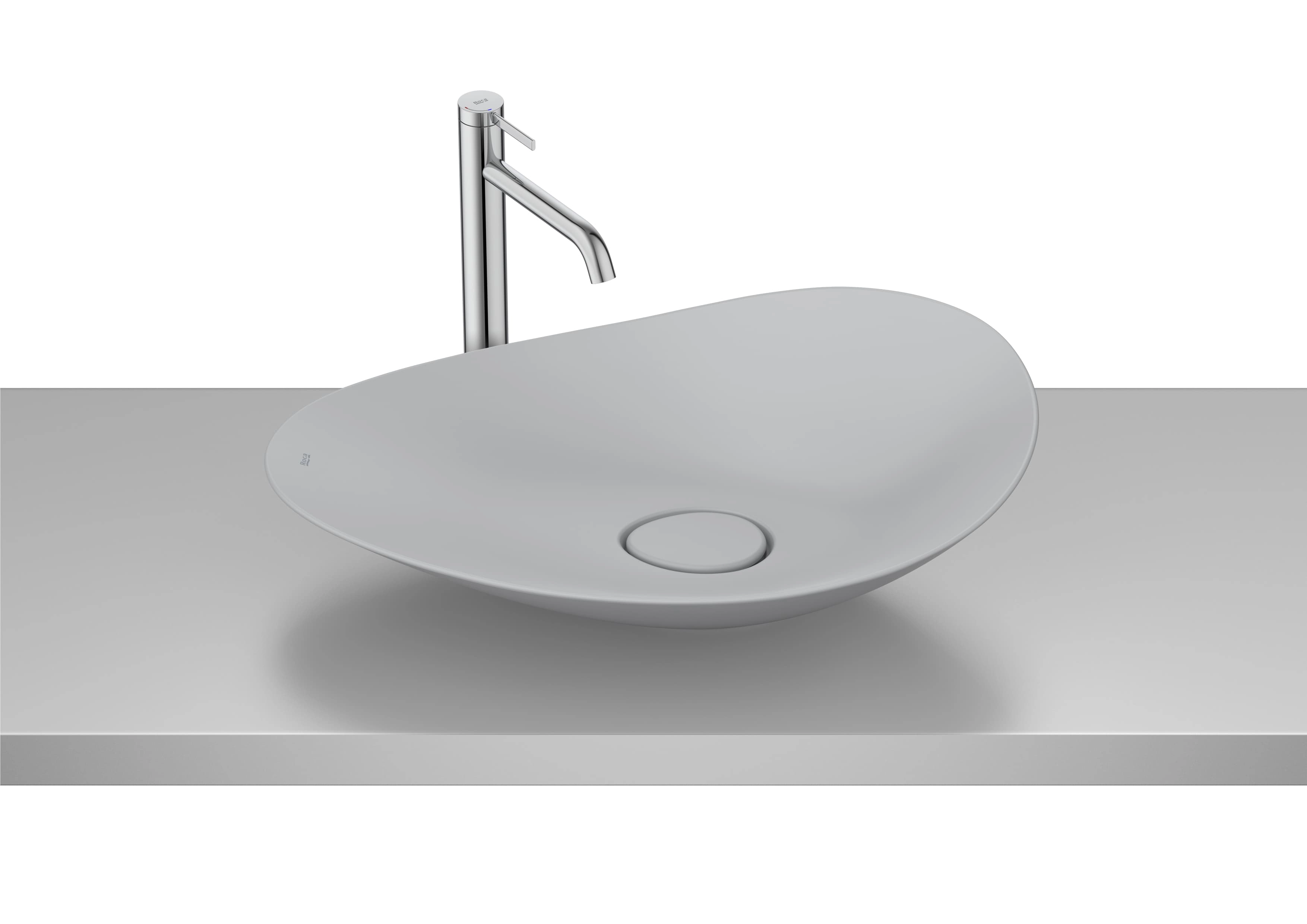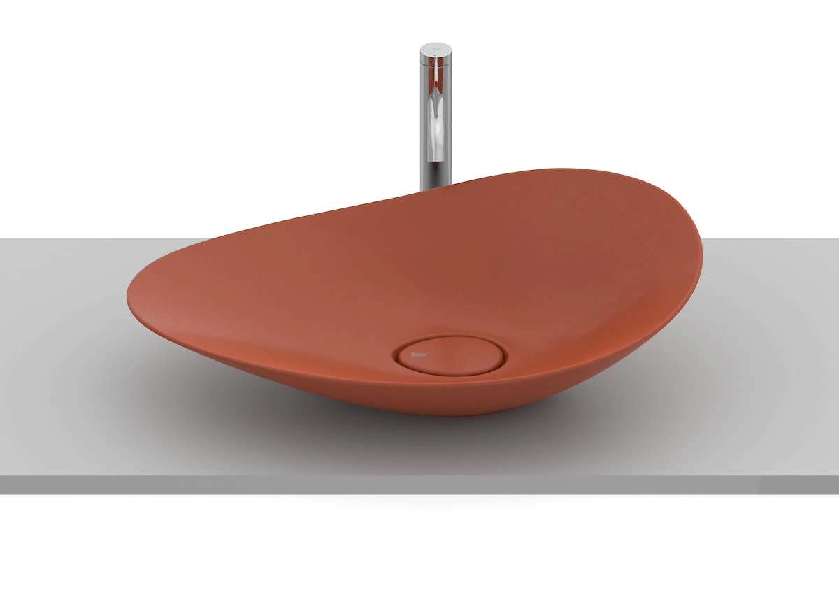 A cuba de apoio oval FineCeramic® Ohtake da Roca combina forma orgânica e beleza atemporal. Inspirada na simplicidade e fluidez da natureza, particularmente no formato do “copo-de-leite”.